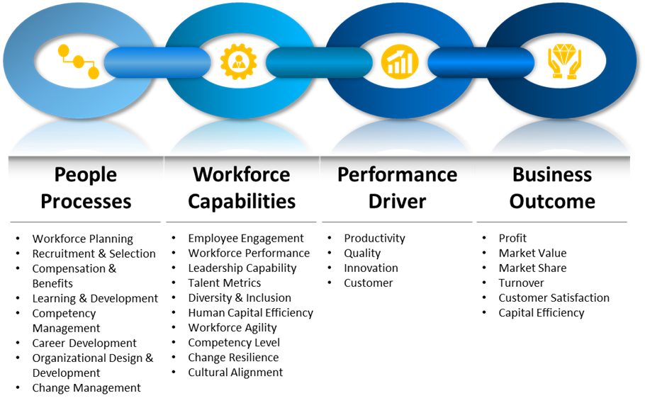 Demnach werden Ursache-Wirkungs-Zusammenhänge und Korrelationen zwischen People/HR-Prozessen, Mitarbeiterkompetenzen, Leistungstreibern und Geschäftsergebnissen transparent. Die Einzelteile lassen sich bewerten und zu einer Gesamtbewertung fortschreiben. Risikofaktoren werden erkannt und eröffnen Handlungs- und Entscheidungsspielräume.