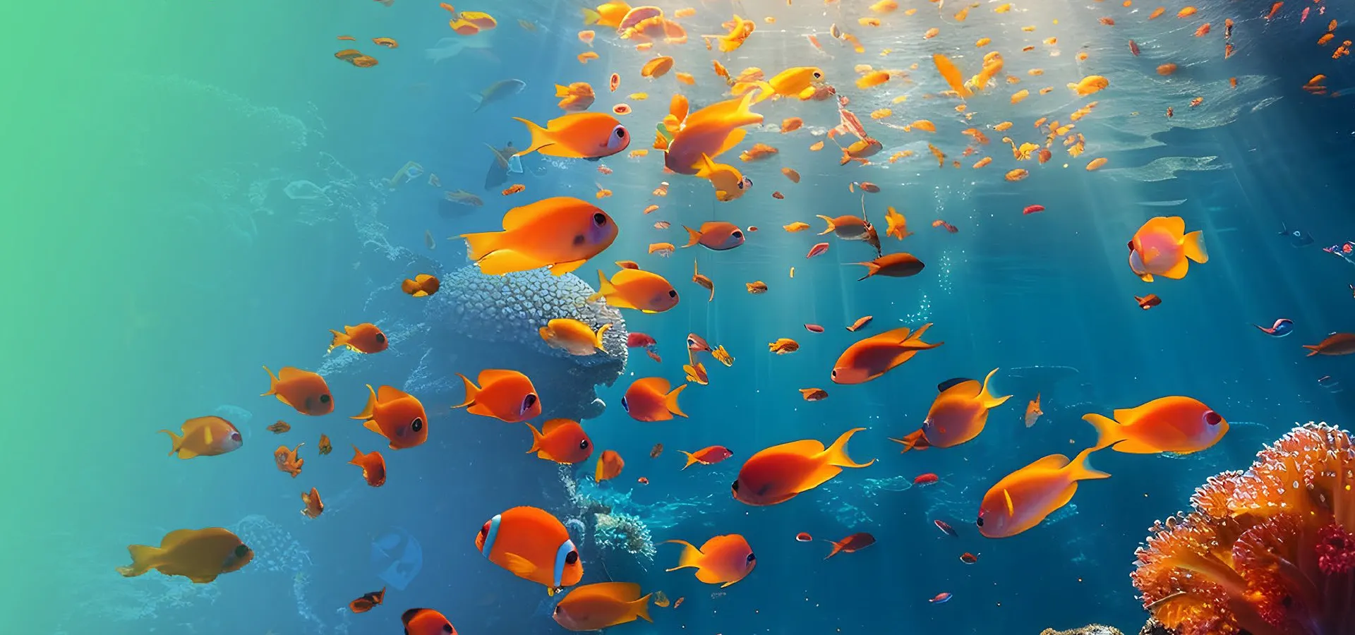 Ein Schwarm kleiner orangefarbener Fische – jeder ein Teil unseres HR-Analytics-Angebots: Daten sammeln, Muster analysieren, Prognosen erstellen und Ergebnisse visualisieren.